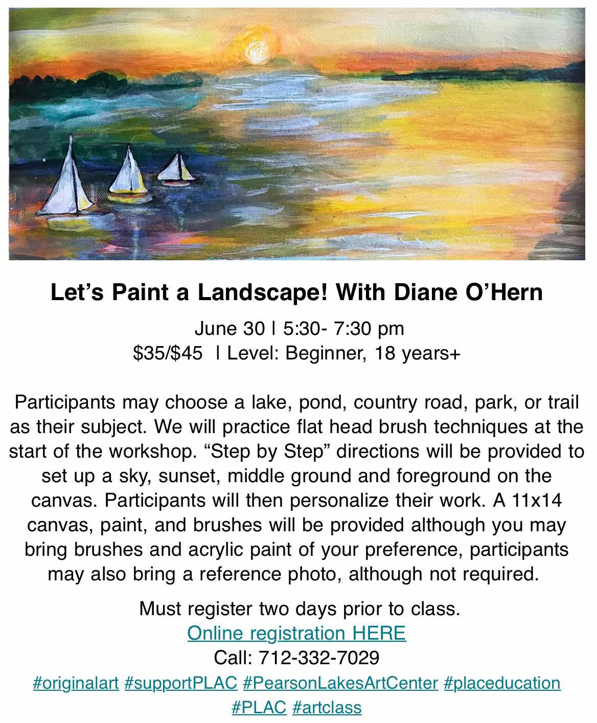 Upcoming Art Class at Pearson Lakes Art Center, Hwy. 71 N Okoboji, Ia 6-30