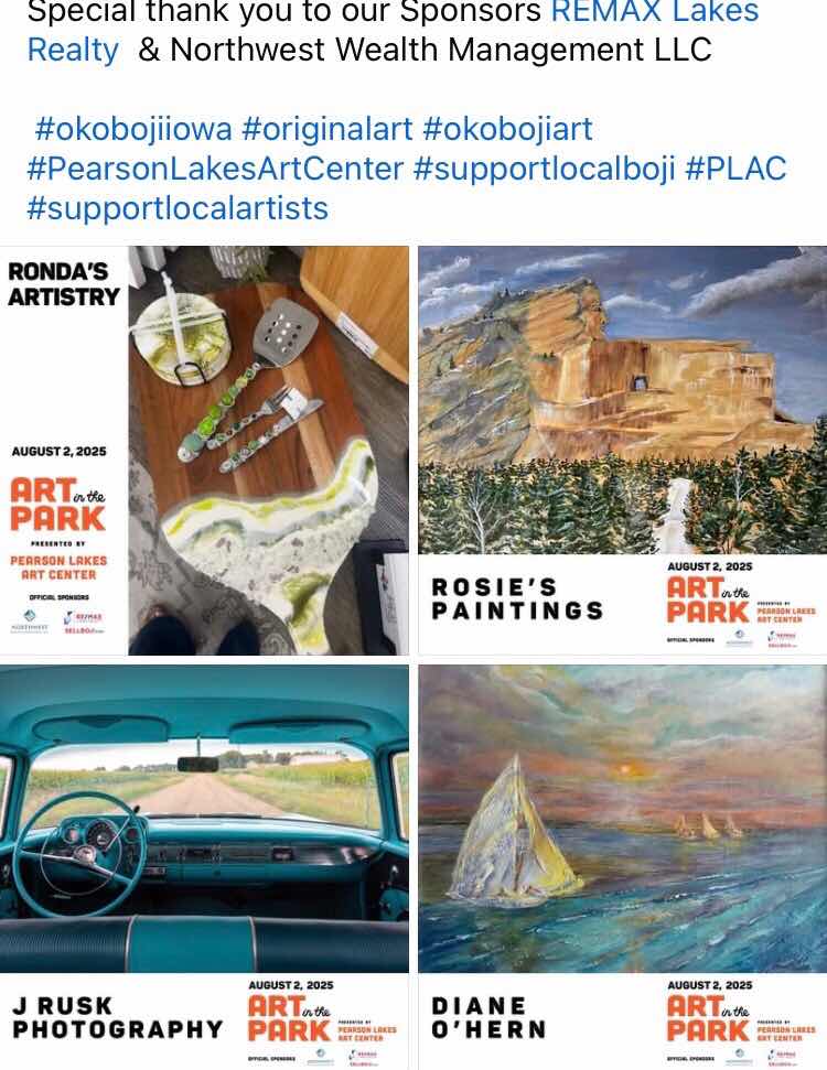 August 2nd Art In The Park. Arnold’s Park, Iowa. 9am- 3 pm