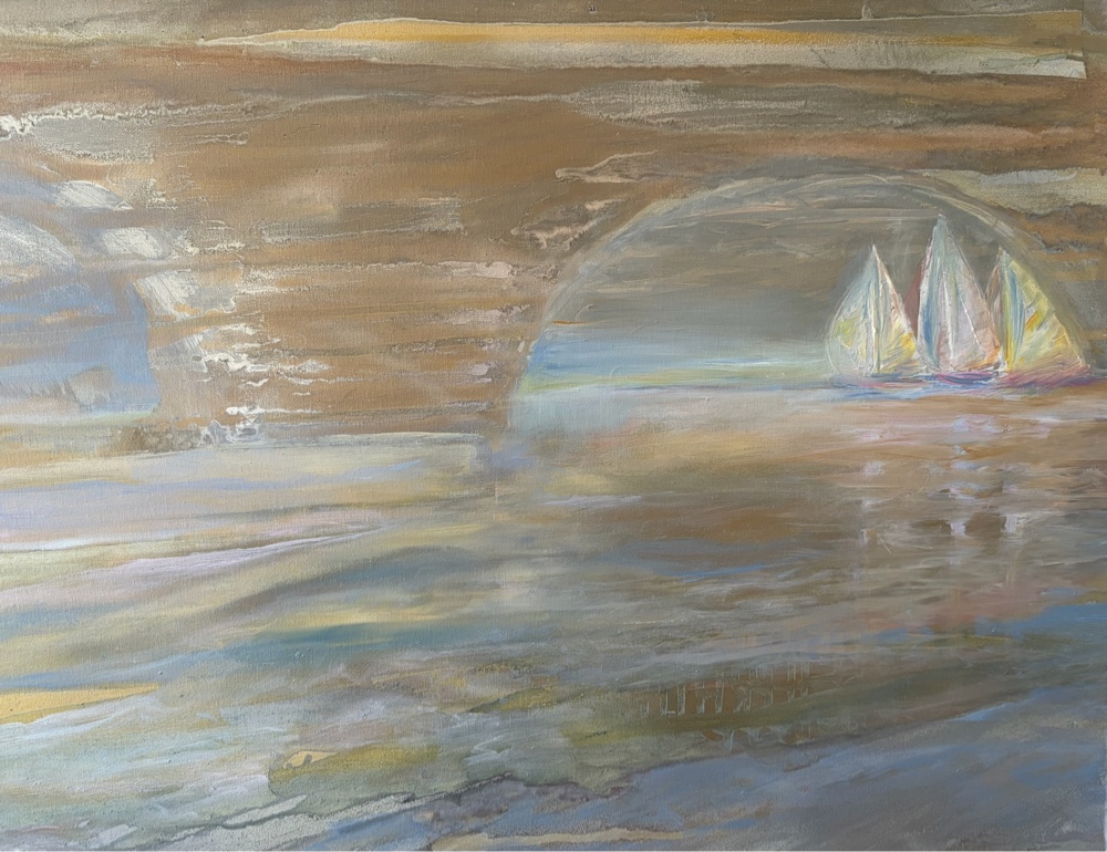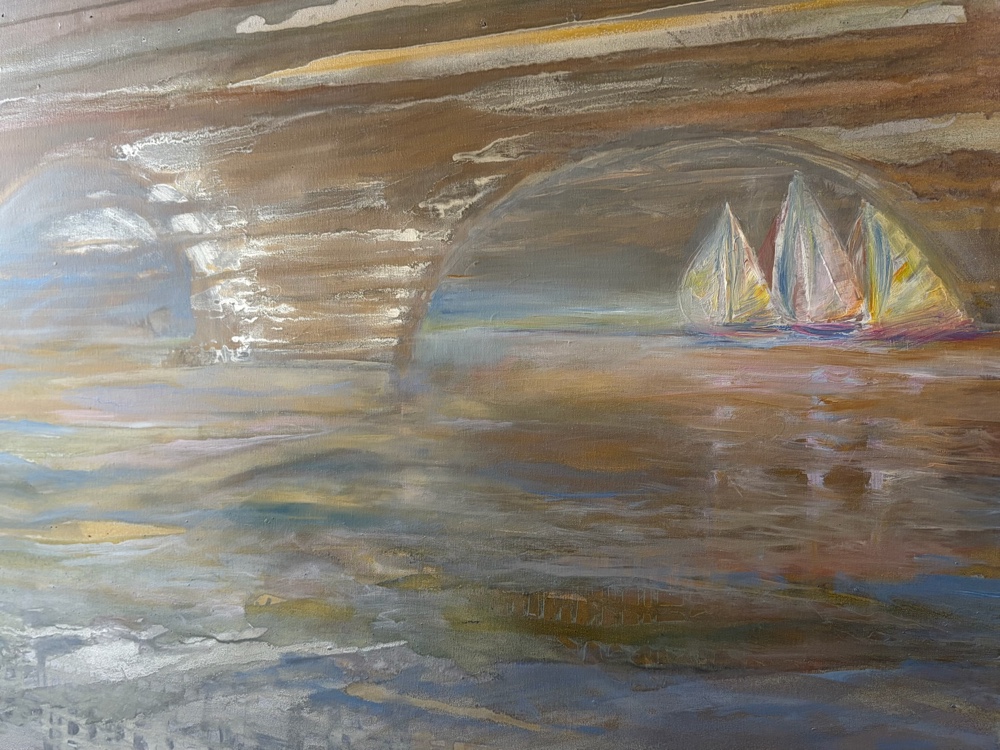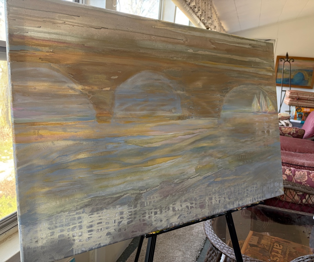 Creating with oil paints on a 36”x 24” stretched canvas to capture a sense of energy and motion on the water.